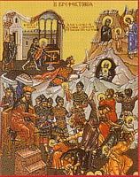 « Ouvre-moi les portes de la pénitence, ô toi qui donnes la vie », nous chantons dans les matines du 1er dimanche dit de pré-Carême. « Lorsqu’un homme part en voyage, nous dit le Père et théologien orthodoxe Alexandre SCHMEMAN, il doit savoir où il va. Ainsi en est-il du Carême. Avant tout, le Carême est un voyage spirituel et sa destination est Pâques » (Alexandre SCHMEMAN, "Le grand Carême, Ascèse et liturgie dans l'Eglise orthodoxe", Abbaye de Bellefontaine, Collection Spiritualité Orientale). Tout au long de l'année liturgique, l'Eglise nous prépare à rencontrer le Ressuscité. Le Carême de Pâques est une intensification de cet effort, un temps de concentration, d'approfondissement et de "reconversion". Comme pour le gladiateur avant d'entrer dans l'arène du combat, l'entrainement est nécessaire. De même, est nécessaire la mise en forme, physique et spirituelle. Ainsi, à travers les quatre dimanches de "pré-carême", qui débutent le 24 février cette année, l'Eglise propose une entrée progressive dans le Carême à travers la Porte de la "pénitence". Le premier dimanche, celui du Publicain et du Pharisien (Luc 18,10-14) est une exhortation à l’humilité, valeur préalable et nécessaire pour toute reconversion, mettant en opposition la prière humble du "publicain" et celle "fière" et "démonstrative" du pharisien. Il nous rappelle que « tout homme qui s’élève sera abaissé mais celui qui s’abaisse sera élevé ». Le deuxième dimanche, celui du Fils Prodigue (Luc 15, 11-32) traite de l’exil de soi, de sa famille et donc de Dieu par le péché, et puis de la pénitence, de la reconversion et du retour vers le Père. « Rentrant alors en lui-même, dit l'évangile à propos du Fils prodigue… je veux partir, aller vers mon père et lui dire, Père j’ai péché contre le Ciel et envers toi… ». Le troisième dimanche, dit du Jugement dernier (Matthieu 25,31-46) [Icône de gauche ci-dessous] est une exhortation à la crainte de Dieu et Sa Justice. « Quelle crainte règnera ce jour-là, quand le Juge siègera sur son Trône terrifiant ... ô mon âme devance la fin, hâte-toi de crier. Seigneur, je reviens vers toi, sauve-moi, dans Ton unique bonté ». Le quatrième dimanche dit du Pardon et de l'exil d'Adam, [Icône de droite ci-dessous] clôt la période de préparation et traite du pardon et de la véritable manière et méthode de jeuner. "Quand vous jeûnez, ne vous donnez pas un air sombre comme les hypocrites ... Pour toi, quand tu jeûnes, parfume ta tête et lave ton visage, pour que ton jeûne soit connu, non des hommes, mais de ton Père qui est là, dans le secret ; et ton Père, qui voit dans le secret, te le rendra."