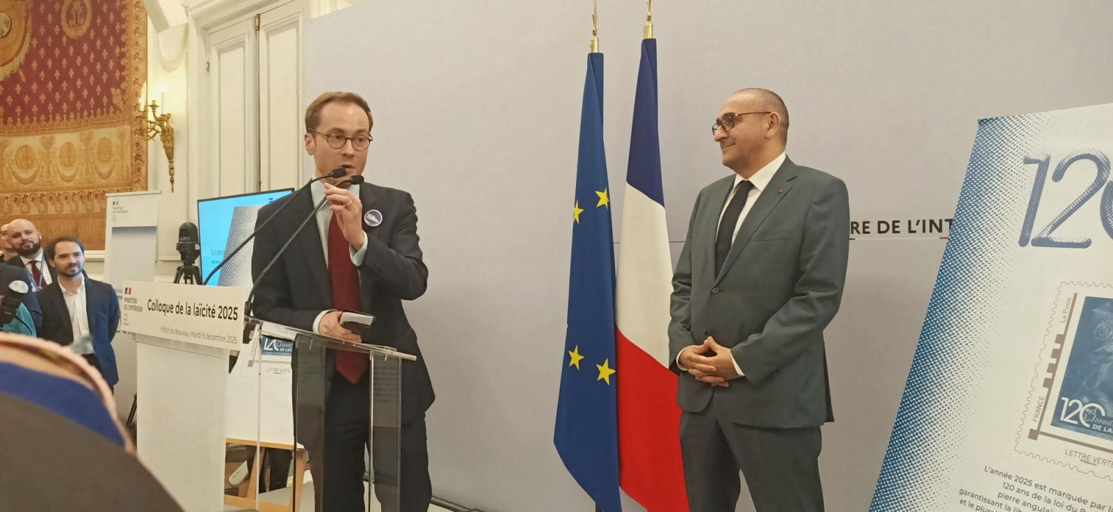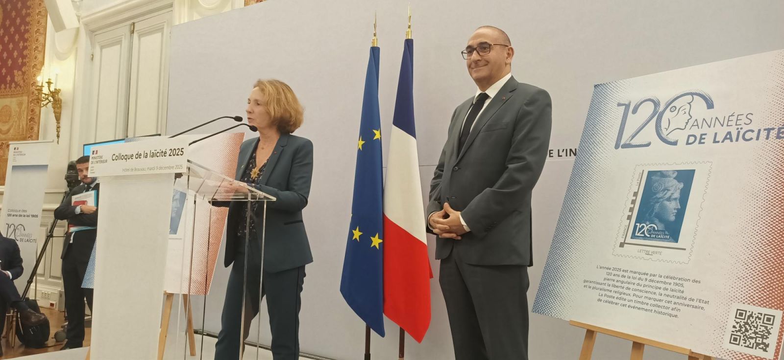 Introduit par M PLOQUIN, le ministre de l'intérieur et des cultes, M Laurent Nuñez, a clôturé le colloque en présence de Mme Marie Ange DEBON présidente du Groupe La Poste, et ensemble ils ont dévoilé le timbre commémoratif des 120 ans de la Loi 1905.
